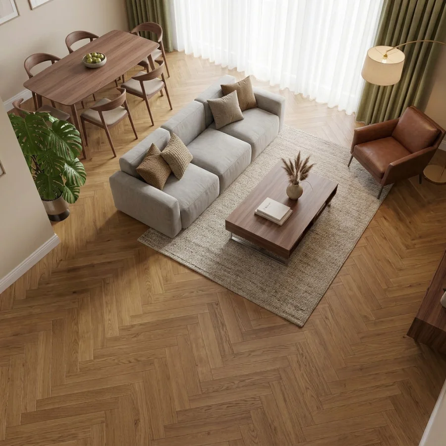 Podłogi drewniane Weitzer Parkett w układzie jodełki to propozycja premium dla osób, które cenią elegancję, naturalne materiały i ponadczasowy styl. Charakterystyczny wzór jodły w połączeniu z naturalnym rysunkiem drewna, szczotkowaną powierzchnią oraz 4-stronną v-fugą tworzy wyjątkowy efekt głębi i podkreśla indywidualny charakter każdej deski, nadając wnętrzu niepowtarzalnej klasy i szyku.
