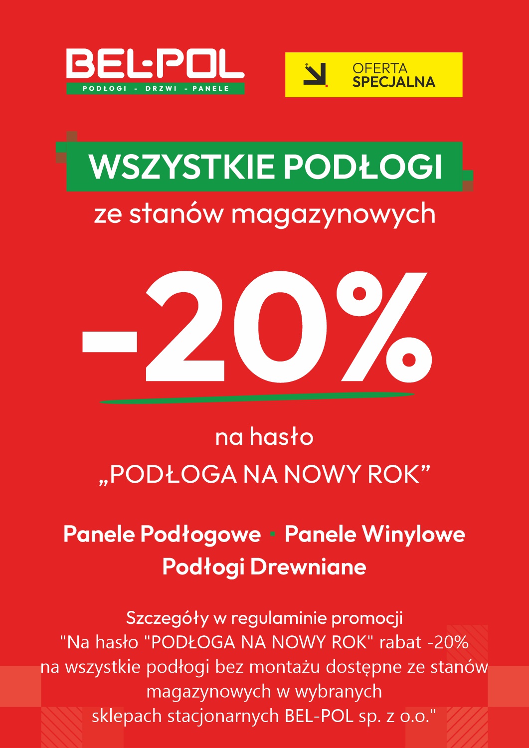*Szczegóły w regulaminie promocji " Na hasło "PODŁOGA NA NOWY ROK" rabat -20% na wszystkie podłogi bez montażu dostępne ze stanów magazynowych w wybranych sklepach stacjonarnych BEL-POL sp. z o.o."