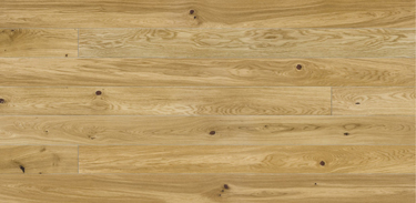 Jasna podłoga o wyraźnym rysunku drewna tworząca wzory z niewielkimi sękami. Zastosowane fazowanie wydłuża ją optycznie nadając jej lekkości. Podłoga zabezpieczona lakierem półmatowym.