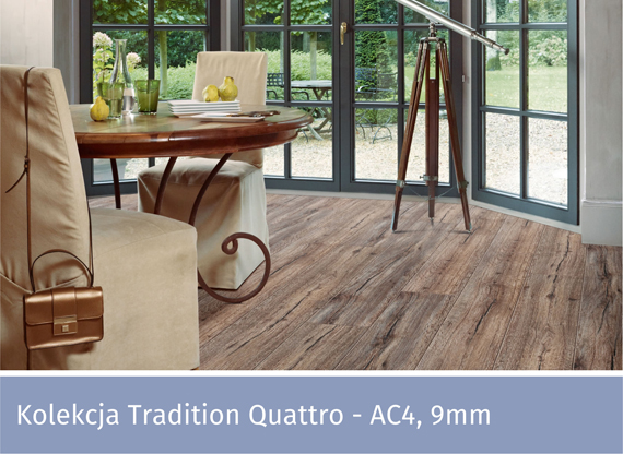 Autentyczny wygląd drewna to Tradition Quattro -panele podłogowe, które przykują Twój wzrok. Kolekcja zawiera dziesięć atrakcyjnych drewno- podobnych deseni. Autentyczny aspekt jest uwydatniony przez 4-stronną V-fugę. Nie odróżnisz od prawdziwego drewna!