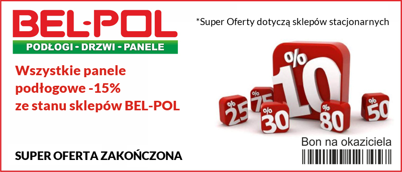 Promocja -15% na wszystkie panele podłogowe dostępne na stanie magazynowym sklepów własnych BEL-POL, obowiązuje wyłącznie przy zakupie również: