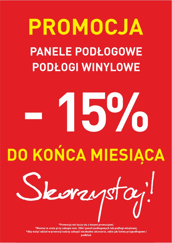 Promocja na wszystkie panele podłogowe i podłogi winylowe, obowiązuje wyłącznie przy zakupie również: podkładu pod panele i listew przypodłogowych.