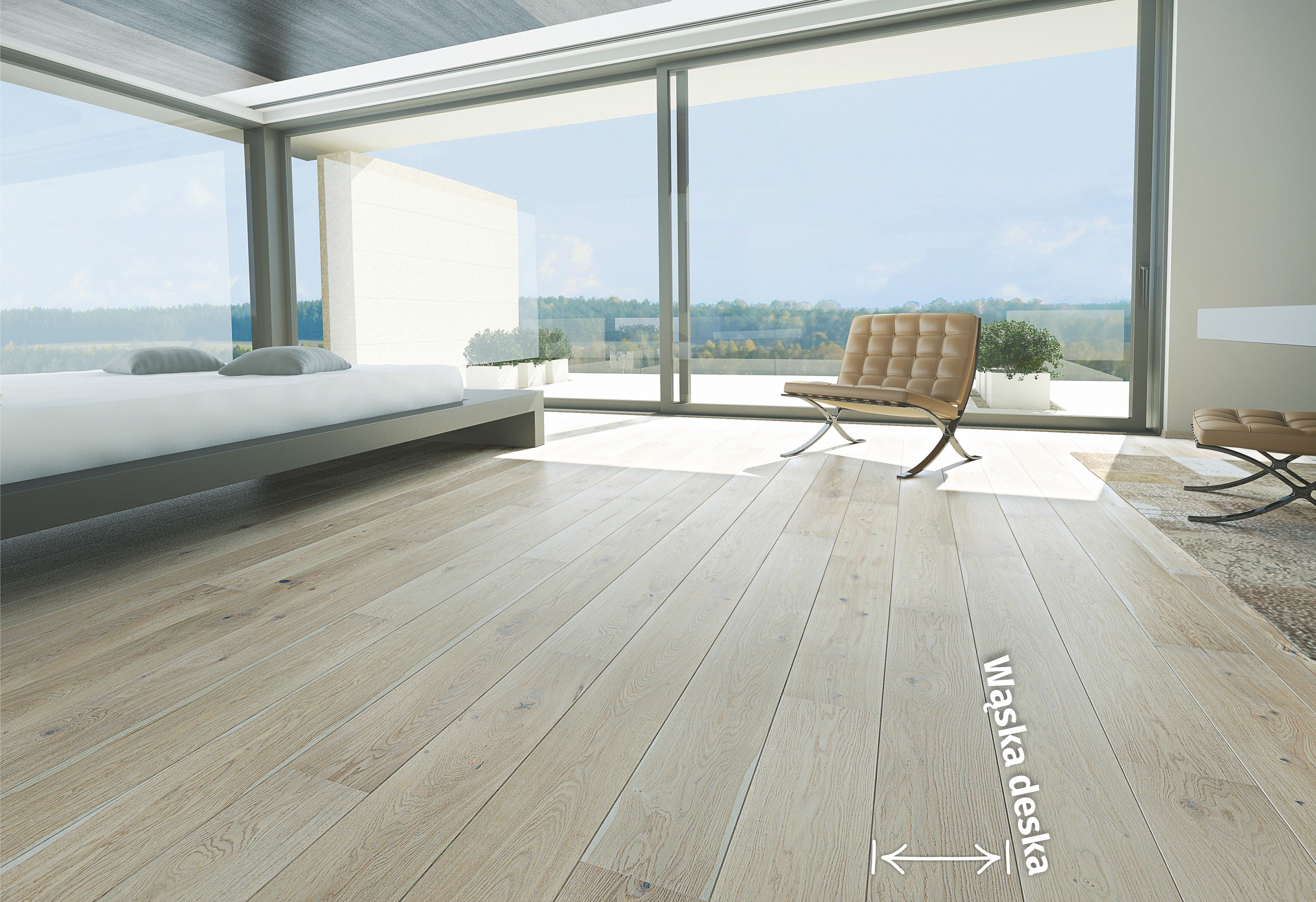 Wąska jednopasmowa długa deska barwiona na odcień popielu. Struktura drewna podkreślona szczotkowaniem oraz fazowaniem, co jeszcze bardziej optycznie wydłuża deski.