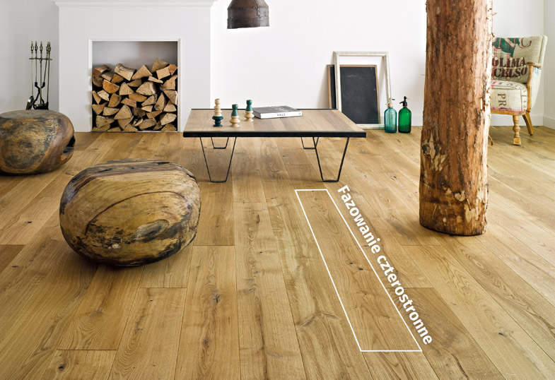 Dębowa deska o postarzanej strukturze drewna wykończona fazowaniem czterostronnym oraz lakierem matowym.