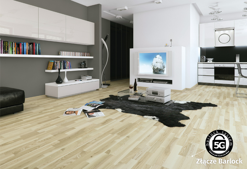Jesionowa deska w szerokim formacie trzypasmowej klepki barwionej wykończonej białym lakierem. Szybszy montaż zapewnia złącze Barlock 5Gs.