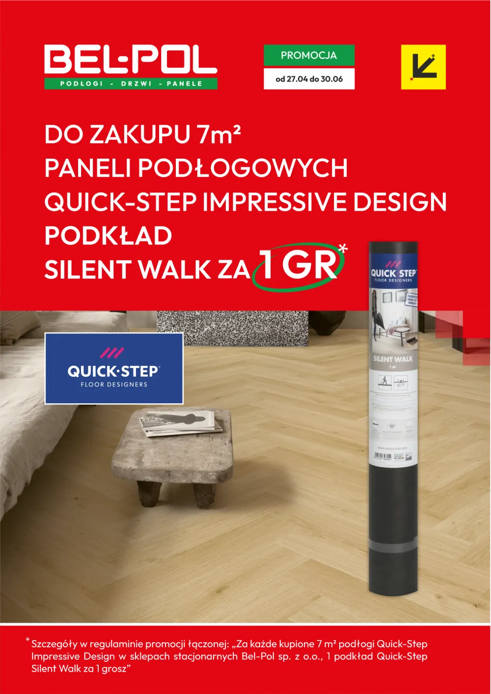 *Szczegóły w regulaminie promocji łączonej ,,Za każde zakupione 7 m2 podłogi Quick-Step Impressive Design w sklepach stacjonarnych Bel-Pol sp. z o.o., 1 podkład Quick-Step Silent Walk za 1 grosz" - 27.04. - 30.06.2026