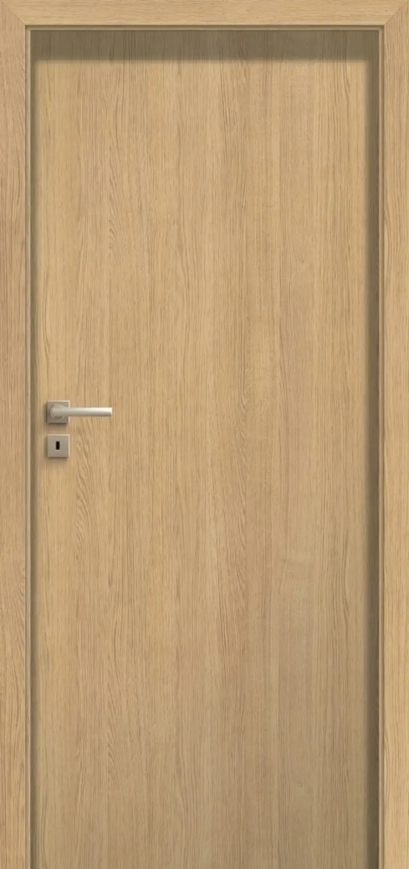 Drzwi zbudowane są z ramiaka drewnianego obłożonego dwiema gładkimi płytami HDF pokrytymi naturalną okleiną dębową. Standardowe wypełnienie stanowi płyta wiórowa pełna. Dostępne w systemie przylgowym, bezprzylgowym oraz REVES.