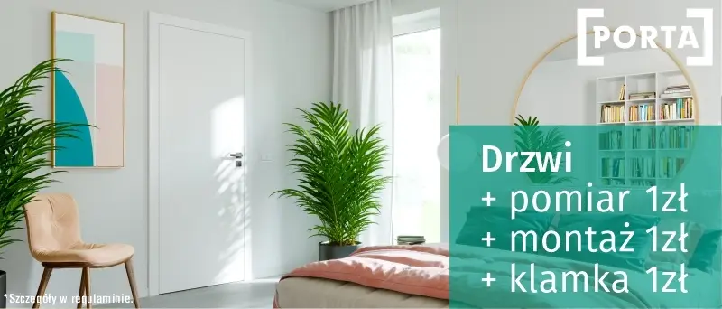 Super oferta na drzwi Porta + pomiar 1zł + montaż 1zł + klamka 1zł. Szczegóły w regulaminie.