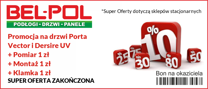 | Oferta dotyczy własnych sklepów stacjonarnych BEL-POL Sp. z o.o. Oferta obowiązuje również w wybranych partnerskich salonach sprzedaży (lista sklepów w regulaminie) Oferta skierowana jest do osób fizycznych, nie firm. Szczegóły oferty w regulaminie oraz u doradców w sklepie. Zdjęcia przedstawiają przykładowe aranżacje drzwi. Promocja dotyczy tylko drzwi z ościeżnicą PS. |