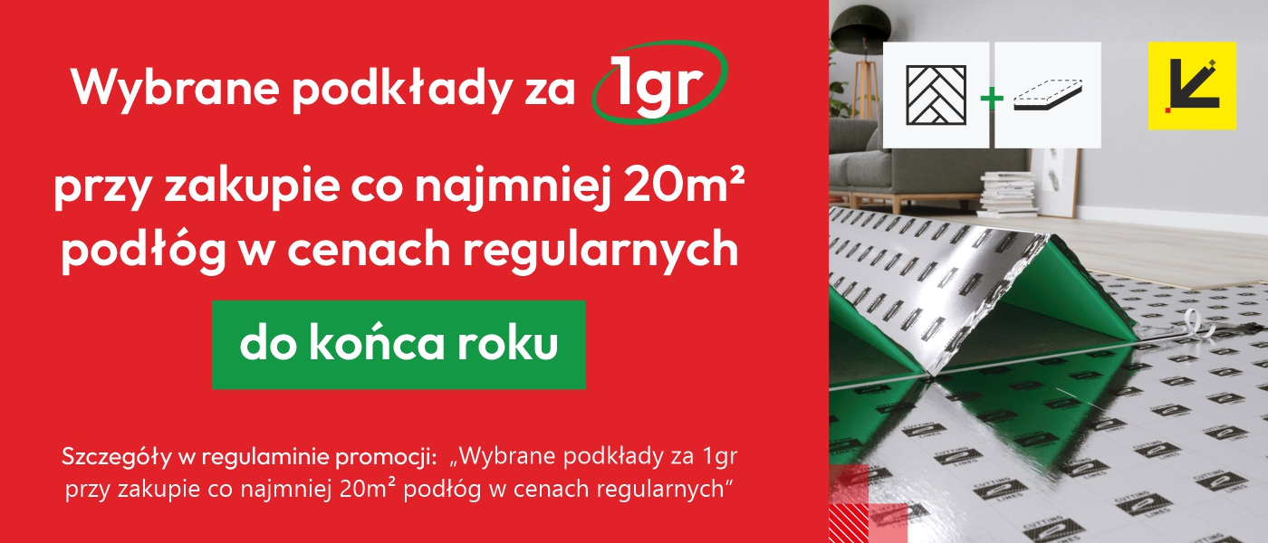 *Szczegóły w regulaminie promocji ,,Wybrane podkłady za 1gr przy zakupie co najmniej 20m2 podłóg w cenach regularnych"